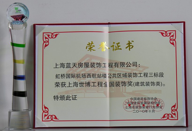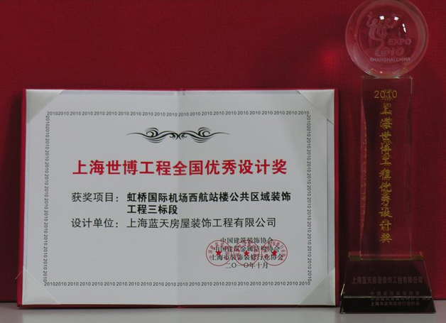 2010年10月,由藍天公司承建的上海虹橋國際機場西航站樓裝飾裝修工程榮獲上海世博·公共建筑裝飾類全國建筑工程裝飾獎和上海世博工程全國優秀設計獎。