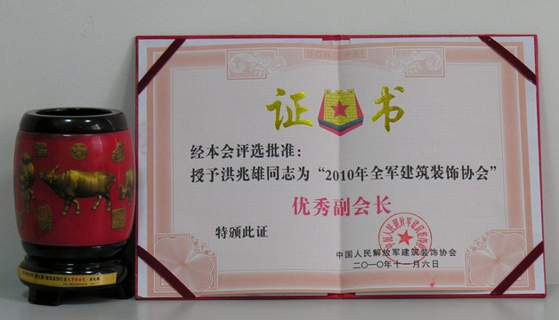 2010年11月,藍天公司洪兆雄總經理被評為2010年全軍建筑裝飾行業優秀企業經理,并被評為協會優秀副會長。
