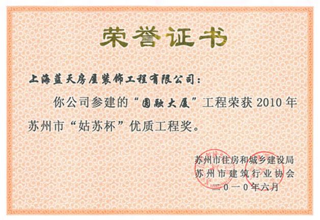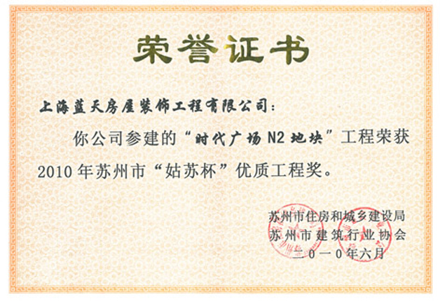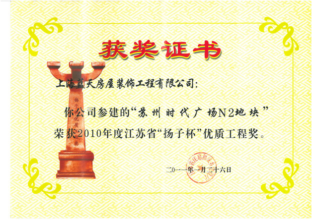 藍天公司蘇州圓融國稅、時代廣場N2地塊這兩個裝飾工程榮獲2010年蘇州市“姑蘇杯”優(yōu)質工程獎。2011年1月,兩工程榮獲2010年度江蘇省“揚子杯”優(yōu)質工程獎。