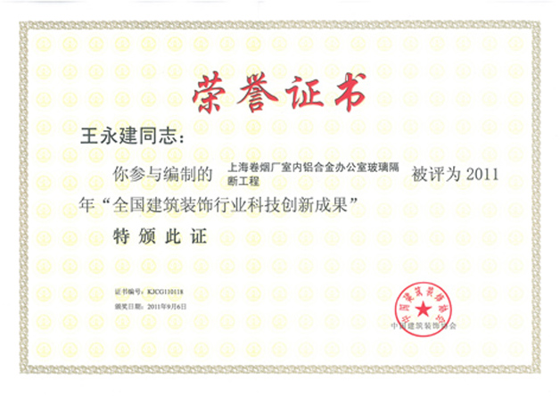2011年9月,藍天公司參建的上海卷煙廠“中華”牌卷煙專用生產線室內裝修專業分包工程,室內鋁合金辦公室玻璃隔斷技術被評為2011年“全國建筑裝飾行業科技創新成果”獎。蘇宏平、王永建、宋金金三人獲得“科技成果”獎榮譽證書。