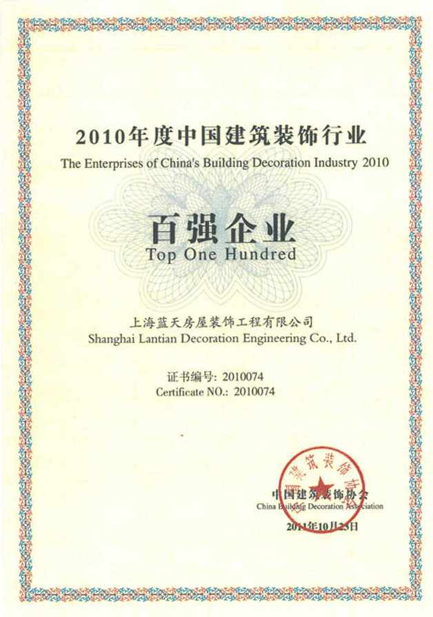 2011年10月,藍(lán)天公司連續(xù)九年被評為中國建筑裝飾行業(yè)百強(qiáng)企業(yè)牌。