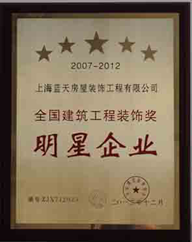 2012年12月,藍天公司2007-2012年連續五屆榮獲全國建筑工程裝飾獎,特被中國建筑裝飾協會授予“全國建筑工程裝飾獎明星企業”光榮稱號。