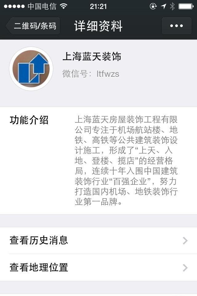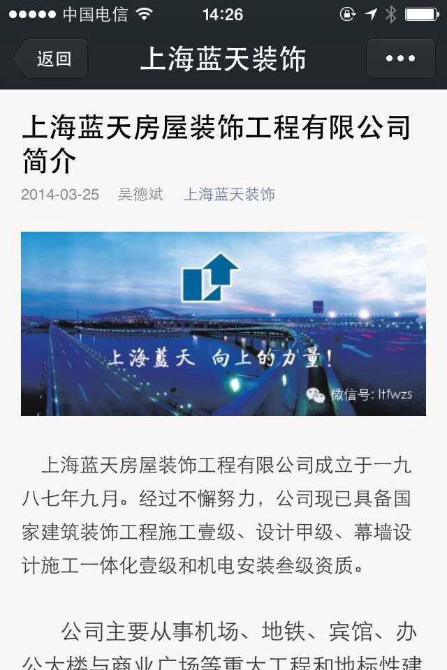 公司已開通微信公眾平臺“上海藍天裝飾”,可通過掃描二維碼或在微信公眾號中搜索"上海藍天裝飾"、"ltfwzs"添加關注。
