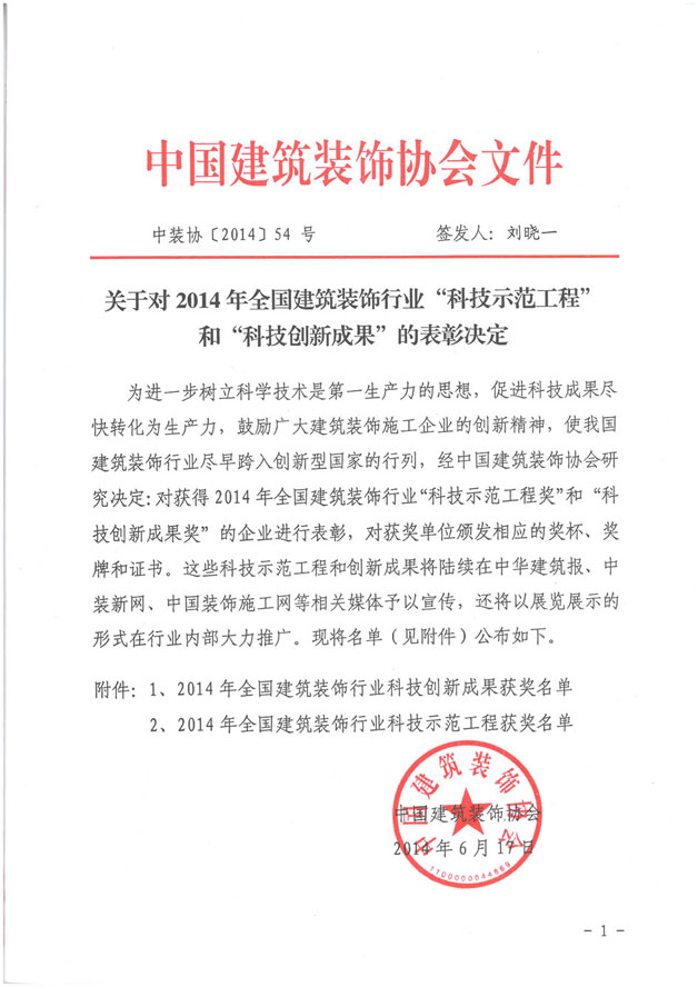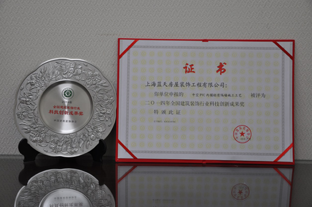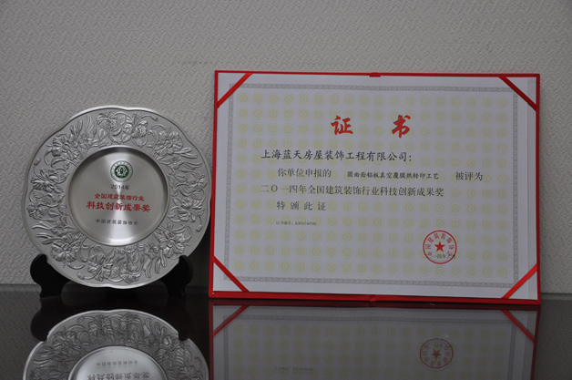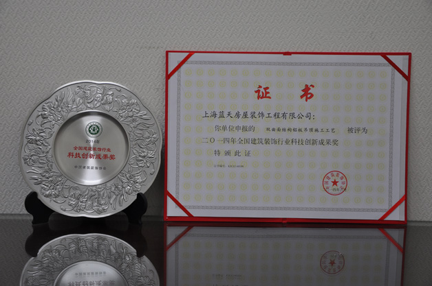 2014年6月,藍(lán)天公司承建的上海松江老城區(qū)公共交通配套5標(biāo)段松江南站車(chē)站裝修工程被評(píng)為2014年“全國(guó)建筑裝飾行業(yè)科技示范工程獎(jiǎng)”;同時(shí)藍(lán)天公司“中控PVC內(nèi)模輕質(zhì)隔墻施工工藝”、“雙曲面結(jié)構(gòu)鋁板吊頂施工工藝”、“圓曲面鋁板真空覆膜熱轉(zhuǎn)印工藝”被評(píng)為2014年“全國(guó)建筑裝飾行業(yè)科技創(chuàng)新成果獎(jiǎng)”。