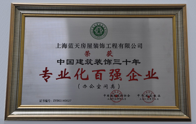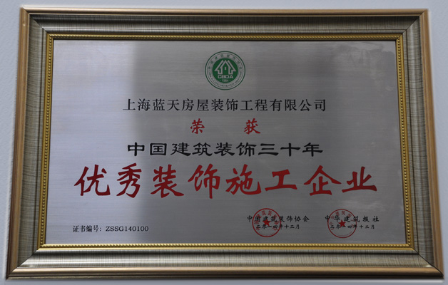 上海藍天房屋裝飾工程有限公司被評為“中國建筑裝飾三十年行業(yè)開創(chuàng)型企業(yè)”稱號、“中國建筑裝飾三十年優(yōu)秀裝飾施工企業(yè)”。