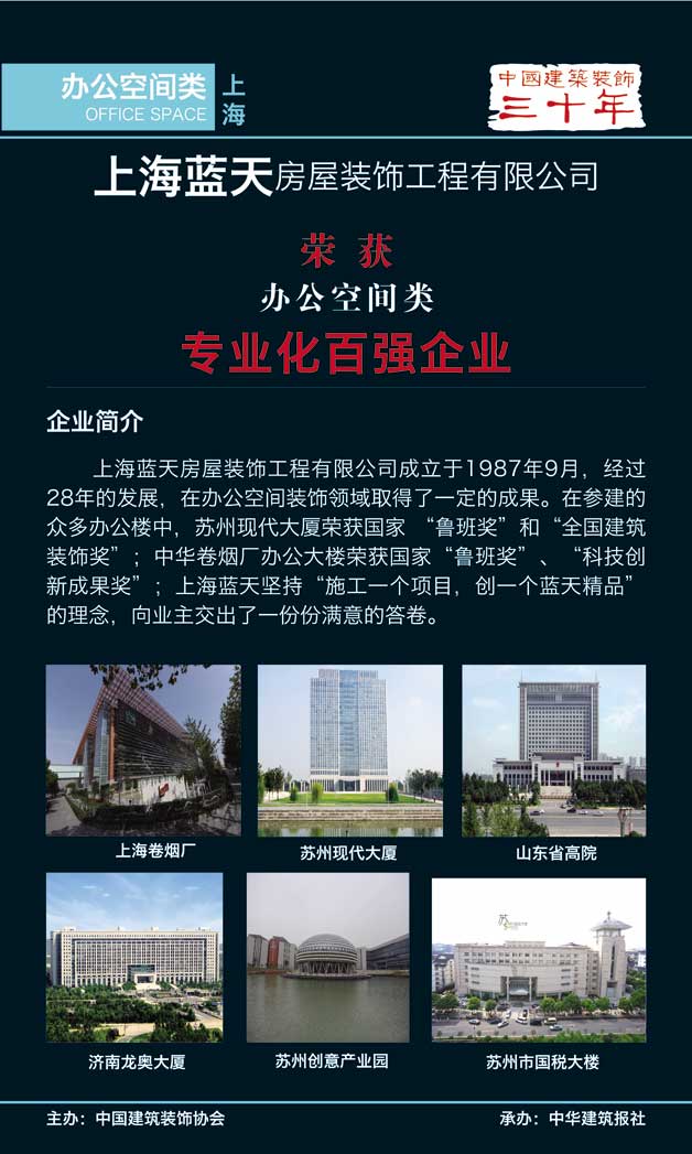 上海藍天房屋裝飾工程有限公司榮獲“辦公空間”類專業(yè)化施工“全國三十強企業(yè)”第六名。