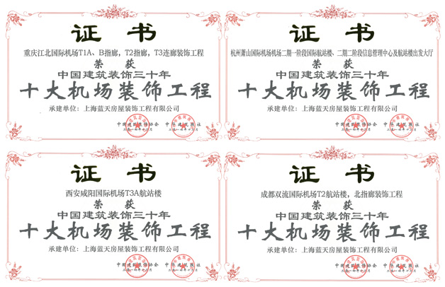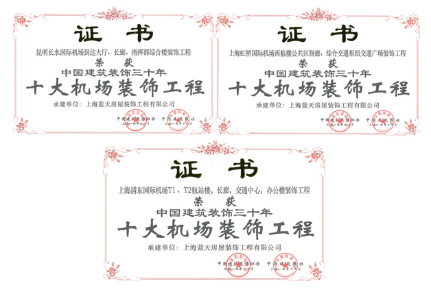 “中國建筑裝飾三十年”十大機場,上海藍天房屋裝飾工程有限公司參建七個。