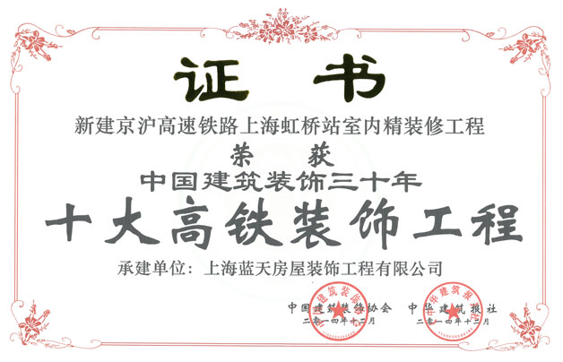 “中國建筑裝飾三十年”十大高鐵,上海藍天房屋裝飾工程有限公司參建一個。