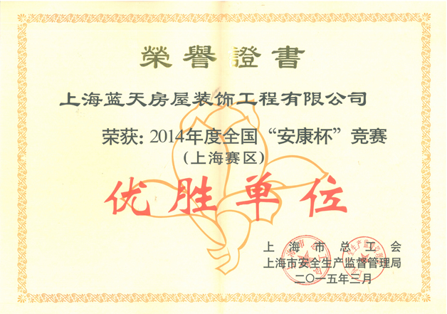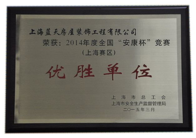2015年,上海藍天裝飾被上海市總工會、上海市安全生產監督管理局評為“2014年度全國‘安康杯’競賽(上海賽區)優勝單位”。自2011年以來,我公司已連續4次被評為 “安康杯”競賽(上海賽區)優勝單位。