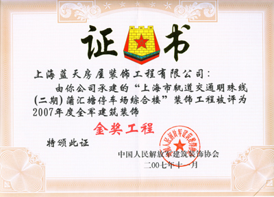 2007年,藍天公司被評為全軍建筑裝飾行業誠信企業;軌道交通蒲匯塘停車場綜合樓裝飾工程被評為全軍“金獎工程”。