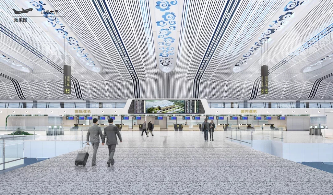 本工程包括航站樓出發層、到達夾層、到達層以及地下換乘大廳部分的室內裝飾工程。對于各專業功能之間的交叉施工、專業性、專用設備要求較為嚴格,尤其是“一關三檢”,要求與機場相關部門緊密溝通。其中機場大吊頂整體由鋁方通、“疊水連山,祥云瑞彩”的祥云圖案遮陽系統造型組成,單曲面排布、單曲形態、單向連續波浪形變化曲面、構造復雜,形成了漸變的工藝美,營造出仙氣飄渺,大氣磅礴的視覺盛宴。
